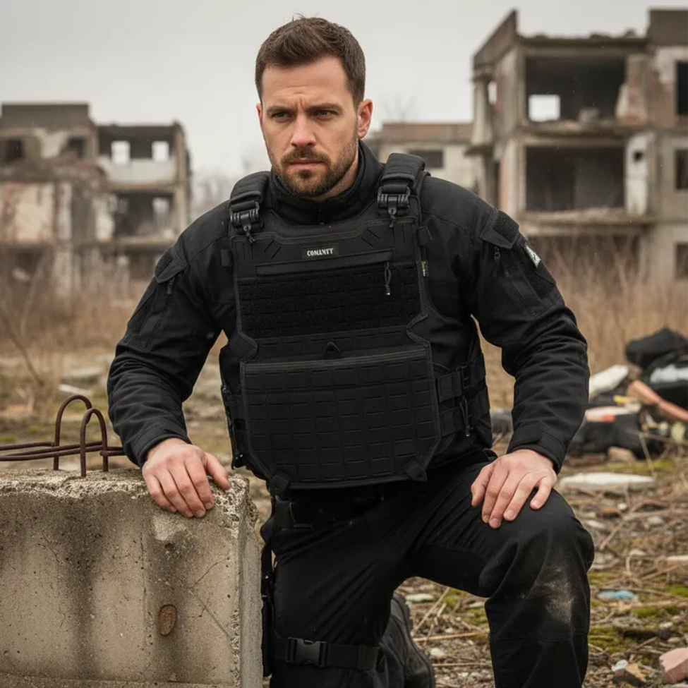 Internamente, comporta placas balísticas rígidas ou flexíveis nos tamanhos padrão. Ajuste lateral e nos ombros em fita reforçada e elástico, garantindo estabilidade mesmo em deslocamentos intensos.